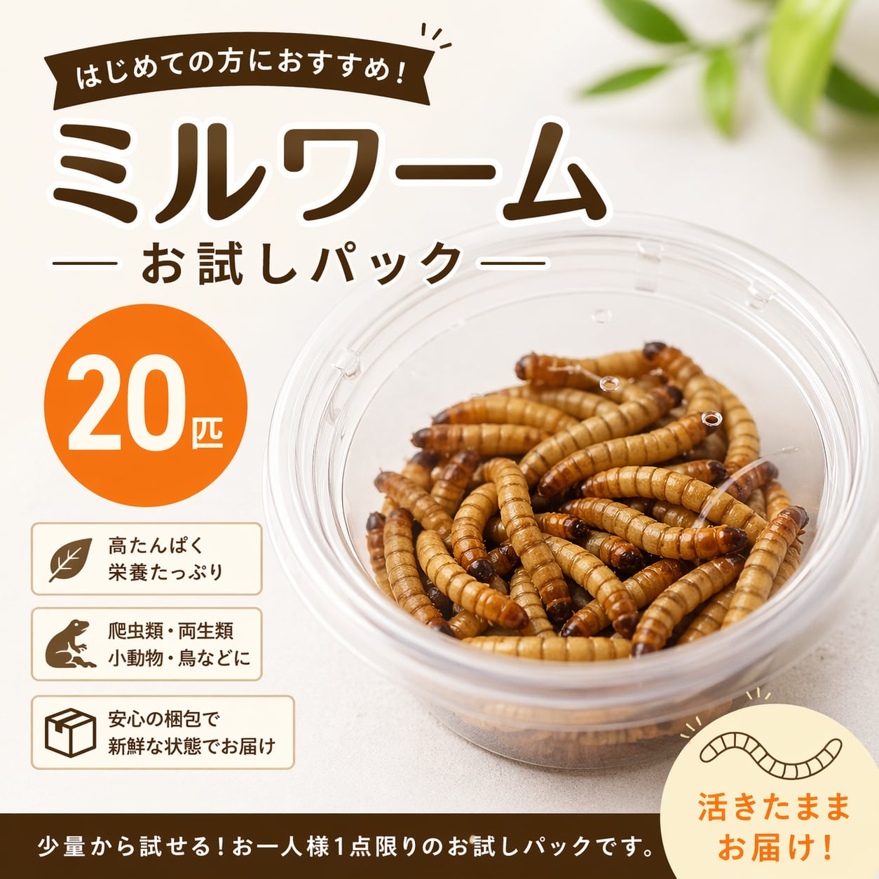 お試しパック 20匹 送料無料 ミルワームが、送料無料でお届けします!この商品は、ペットや小動物にとって栄養豊富な生き餌として最適なミルワームを20匹ご用意したお得なお試しパックです。新鮮で元気なミルワームを、ぜひお試しください!